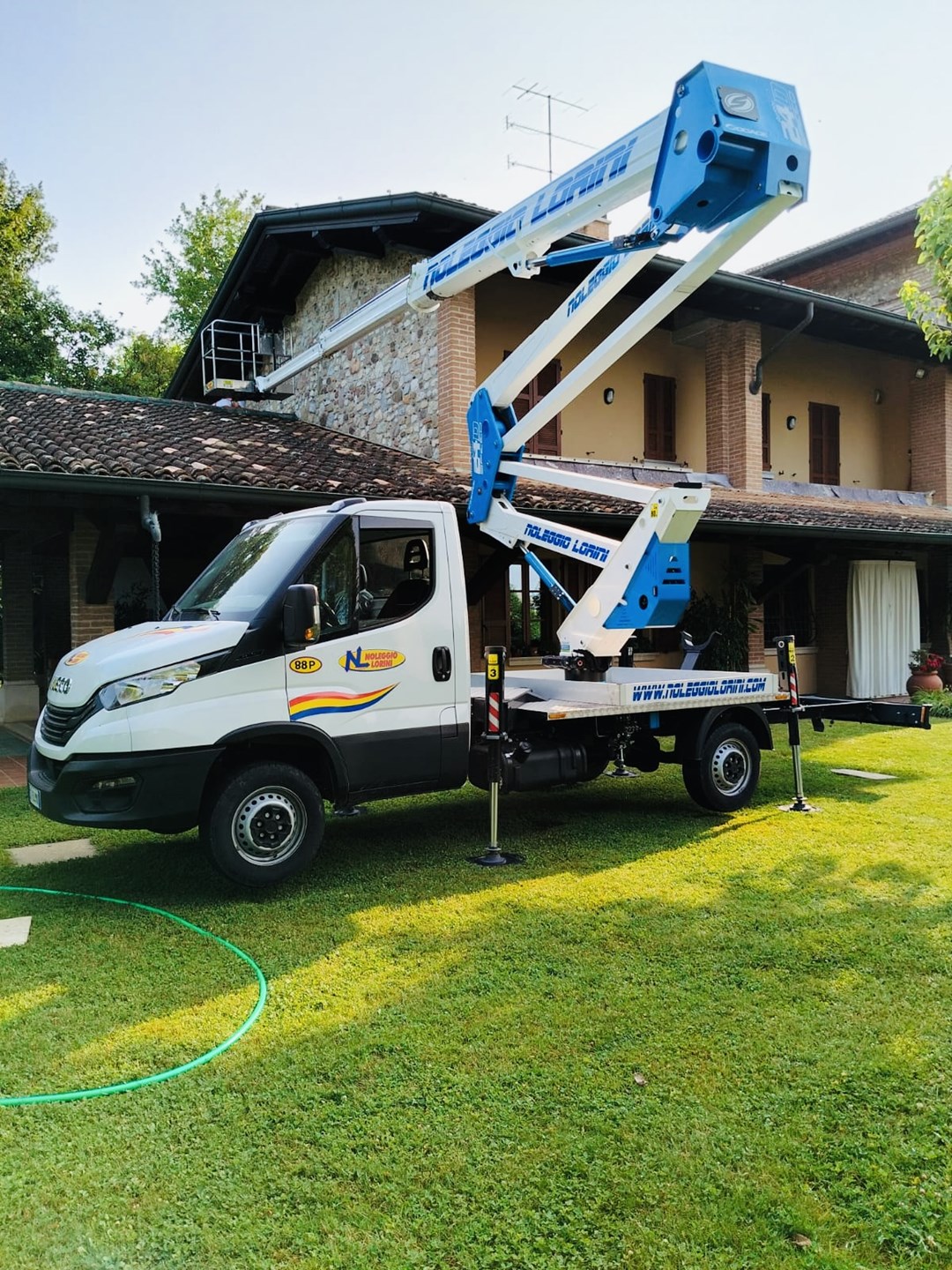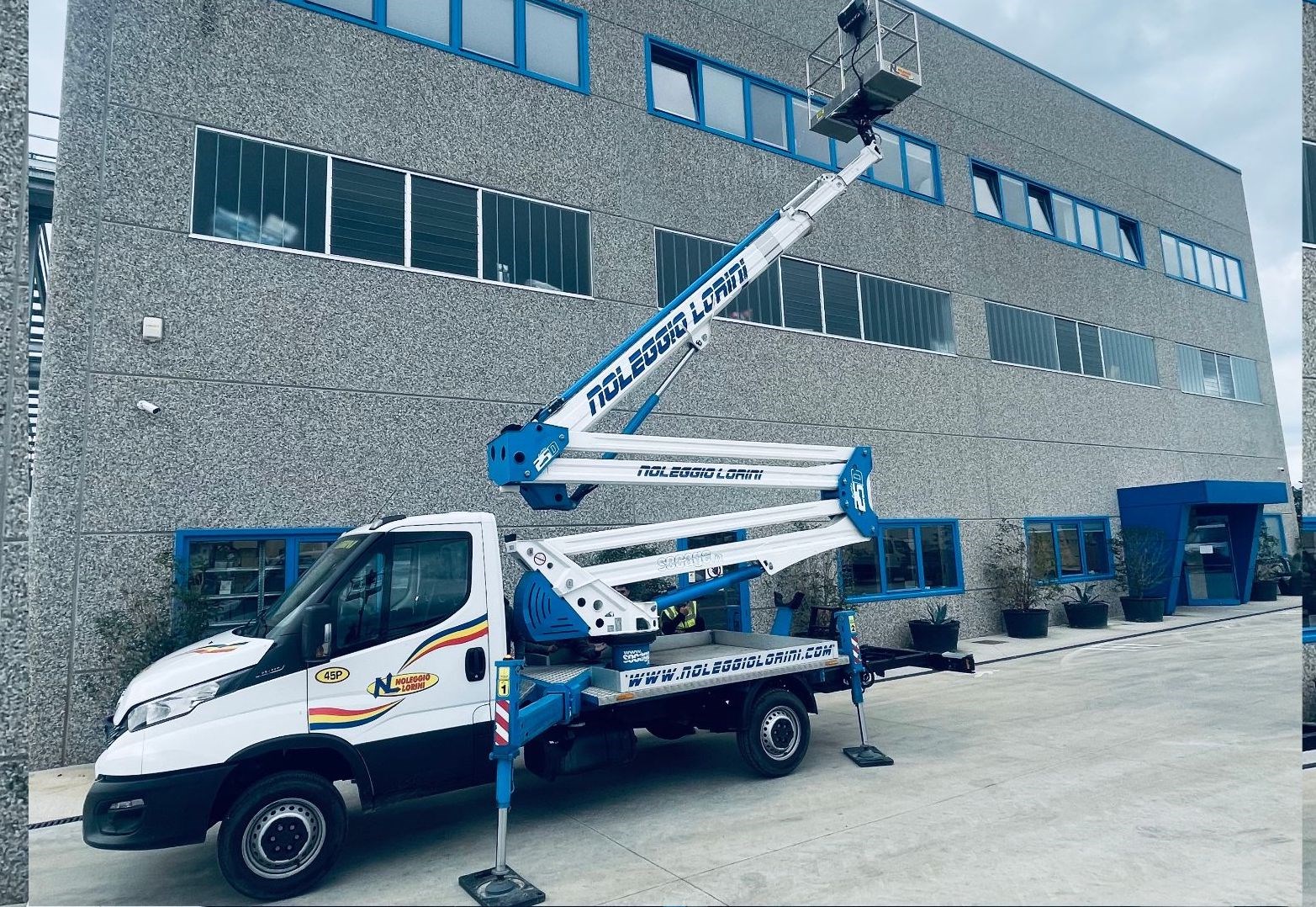 Questa piattaforma aerea autocarrata della flotta Noleggio Lorini raggiunge un'altezza di lavoro di 24 metri, larga poco più di 2 metri è adatta a lavori di qualsiasi tipo.